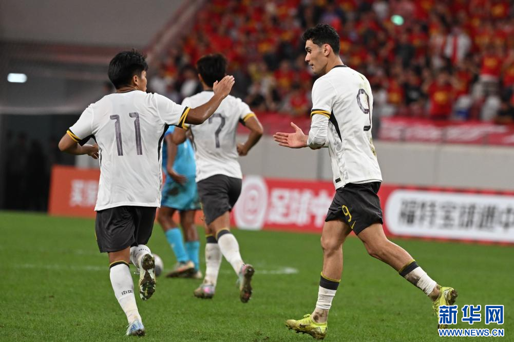 9月6日,中国队球员拜合拉木·阿卜杜外力(右)在进球后庆祝。