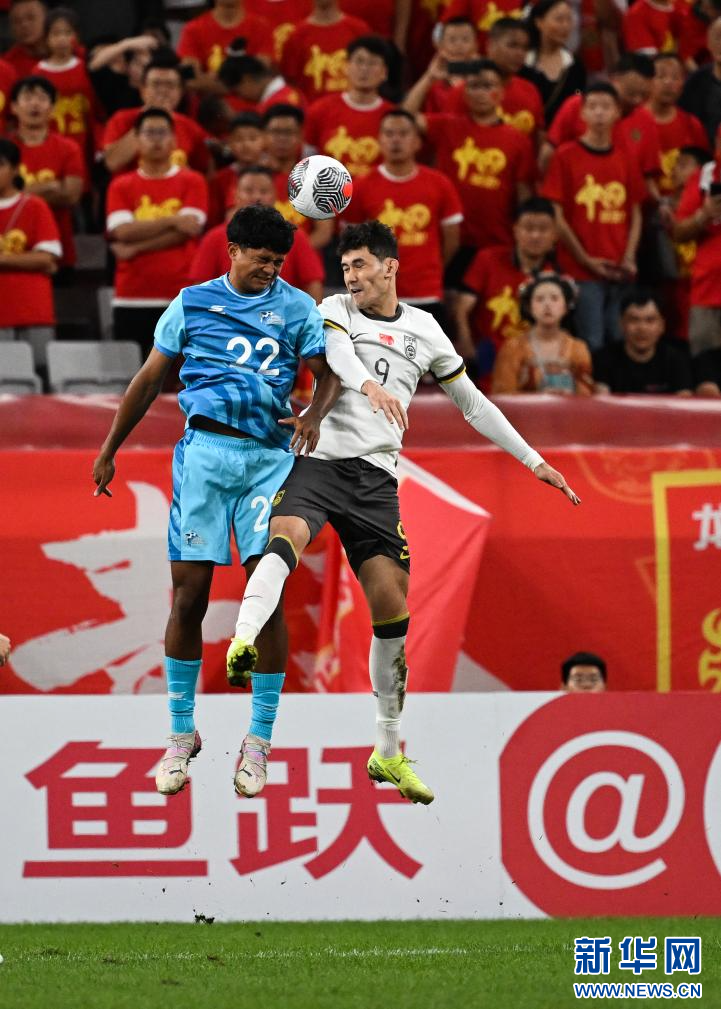 9月6日,中国队球员朱鹏宇(中)在比赛中头球攻门。