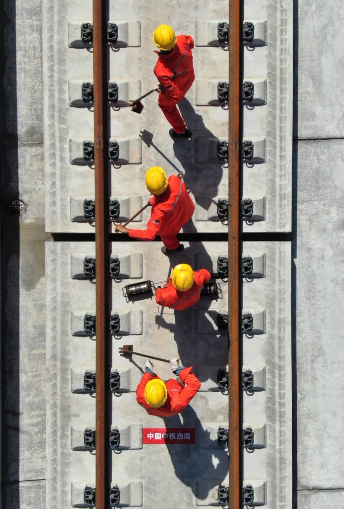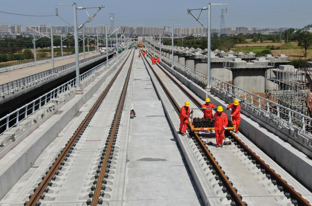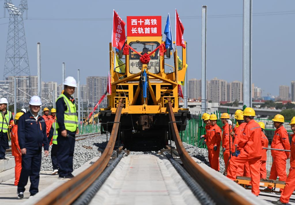 9月8日,施工人员在西十高铁西安东至蓝田区间铺设无缝钢轨。新华社记者 李一博 摄