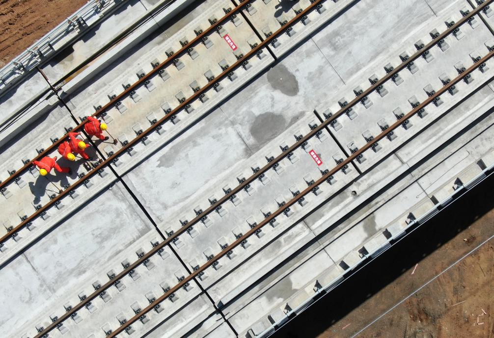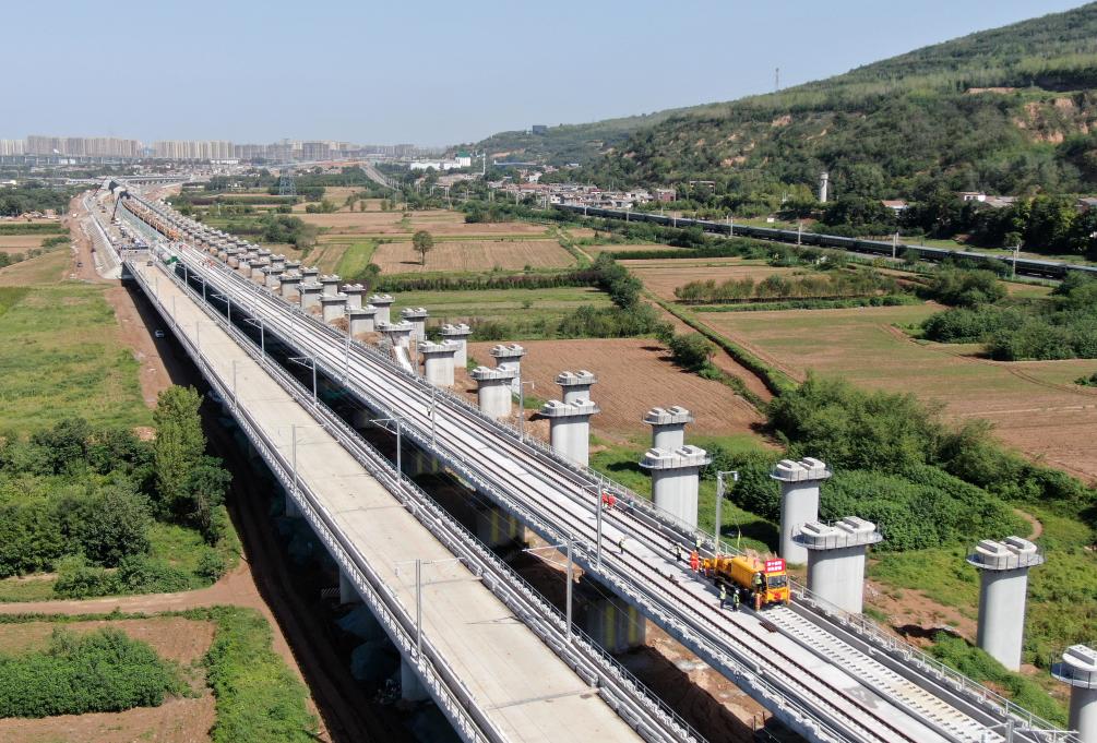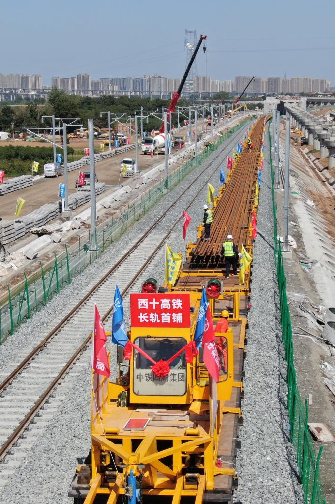 9月8日,施工人员在西十高铁西安东至蓝田区间铺设无缝钢轨(无人机照片)。新华社记者 李一博 摄