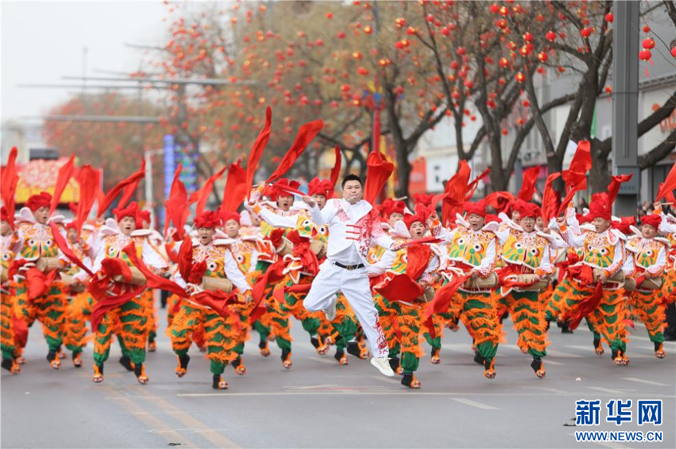 2月12日,横山文旅吉祥腰鼓队在街头为市民游客表演。新华网 王智超摄