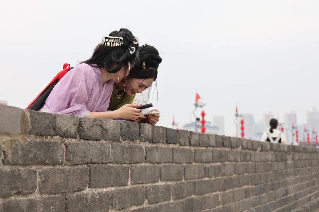 游客在西安城墙上拍照游玩(2025年9月10日摄)。新华社记者 朱唯希 摄