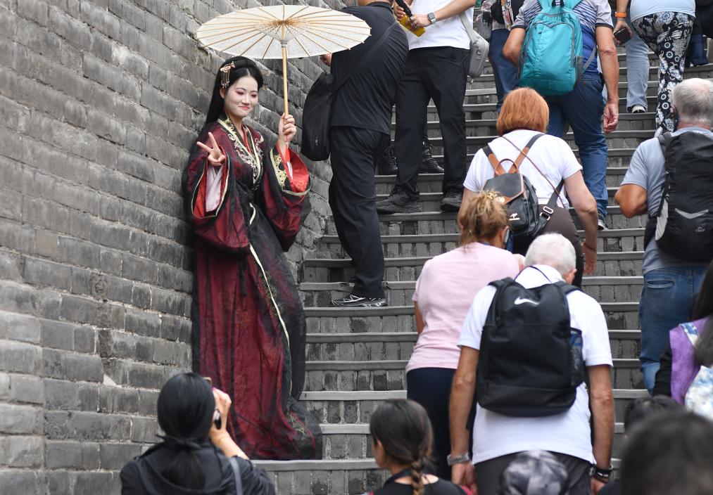 游客在西安城墙永宁门内拍照游玩(2025年9月10日摄)。新华社记者 朱唯希 摄