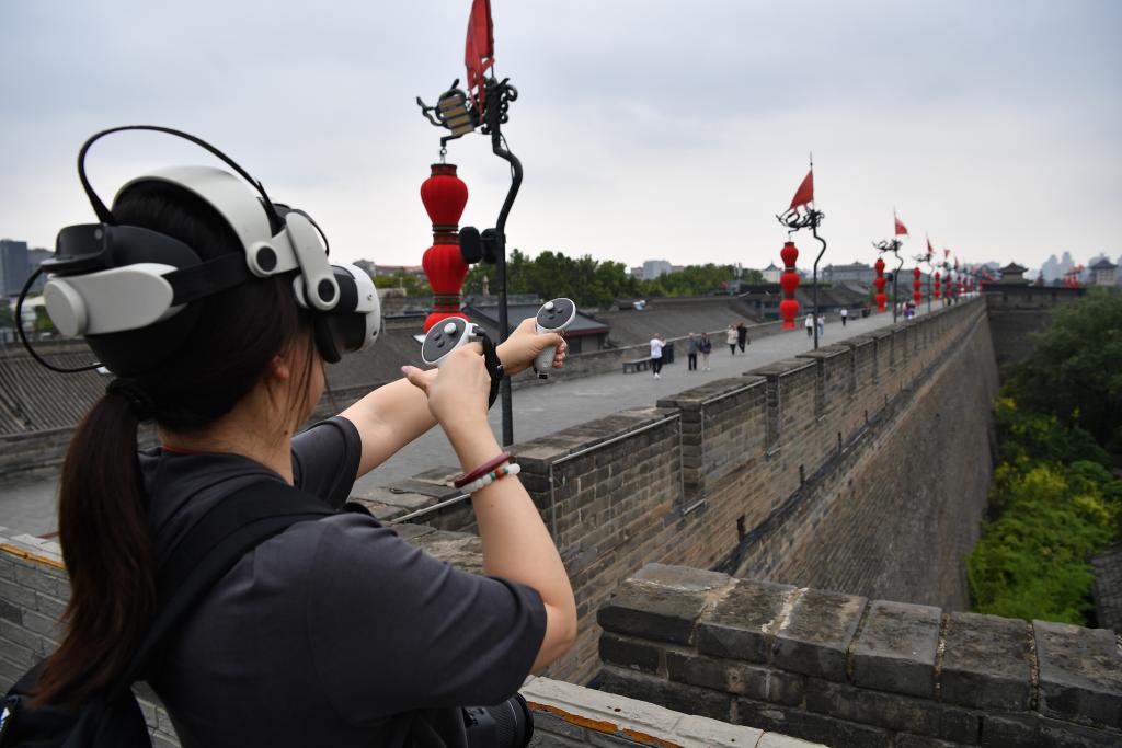 游客在西安城墙一处马面上体验一款以射箭守城为主题的MR混合现实游戏(2025年9月10日摄)。新华社记者 邵瑞 摄