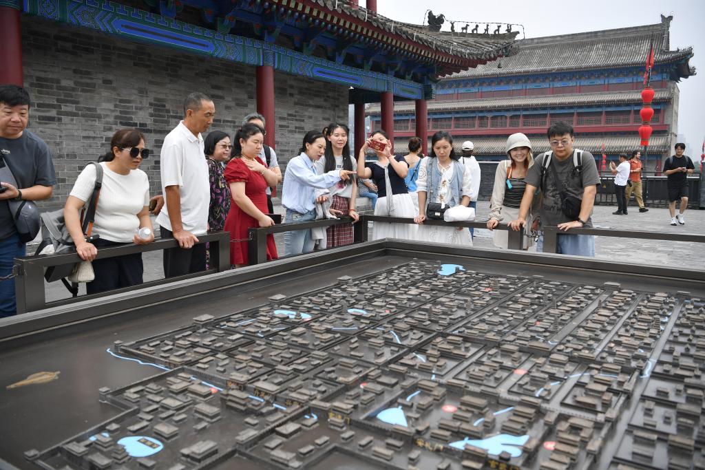 游客在西安城墙上参观唐长安城沙盘(2025年9月10日摄)。新华社记者 邵瑞 摄