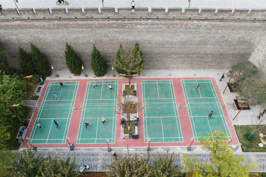 市民在西安城墙外侧环城公园的羽毛球场地上活动(2024年4月9日摄,无人机照片)。新华社记者 邵瑞 摄