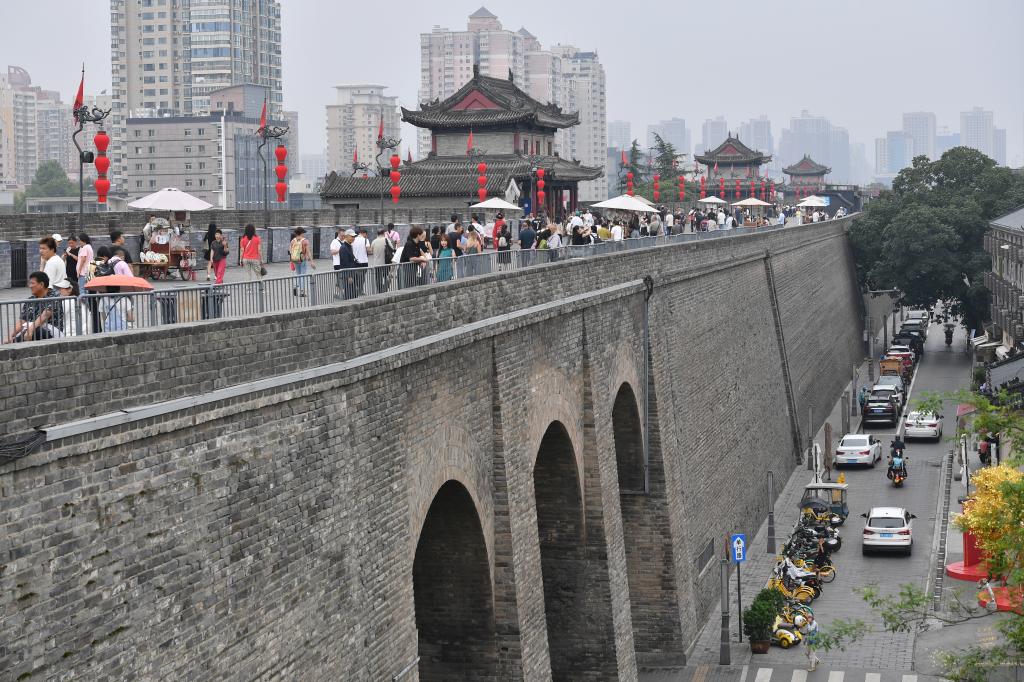 游客在西安城墙永宁门西侧游览(2025年9月10日摄)。新华社记者 邵瑞 摄