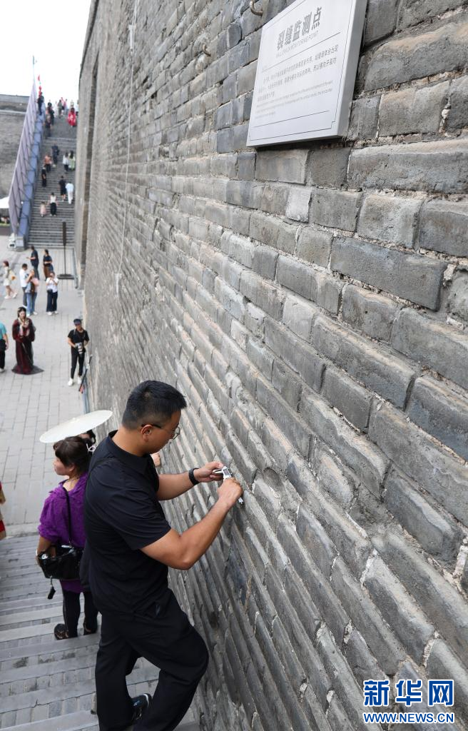 9月10日,一名文保巡查员在西安城墙上测量瓮城东踏步墙体裂缝宽度。