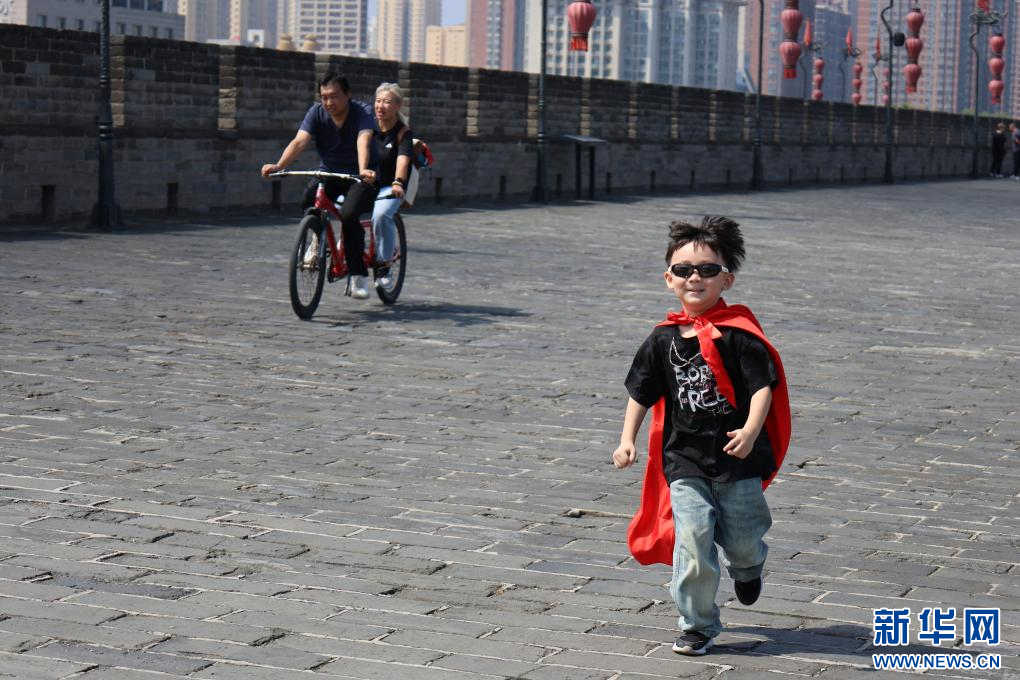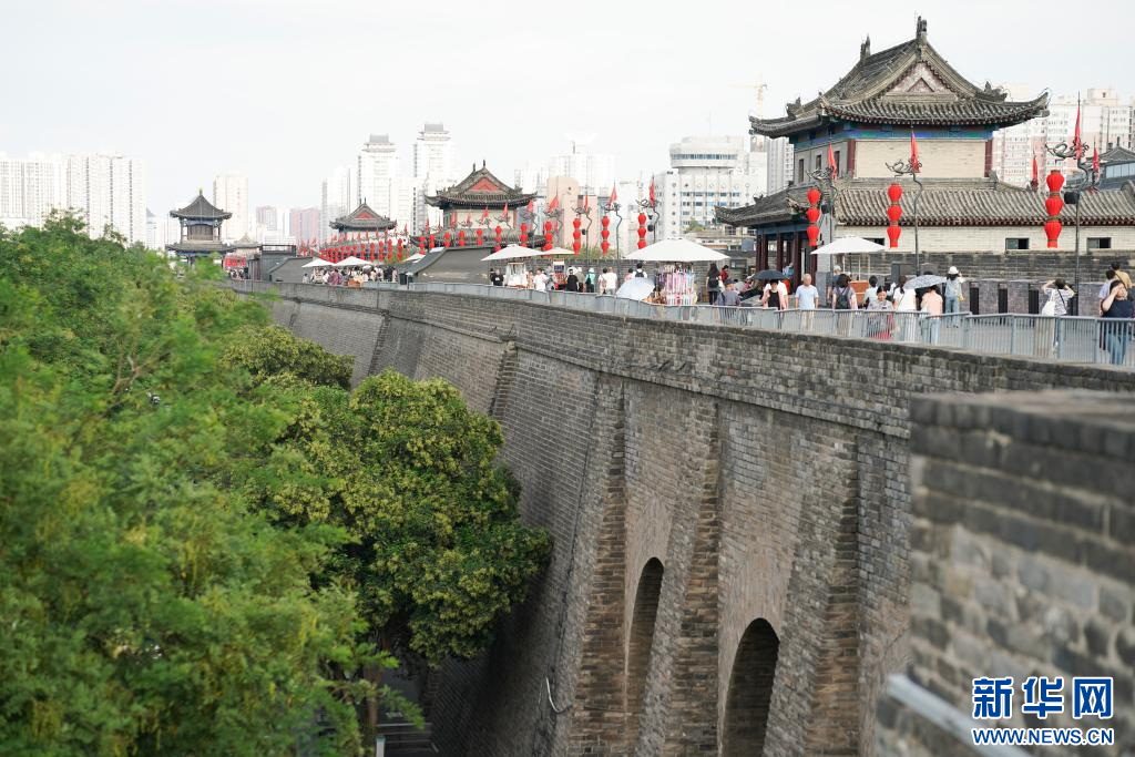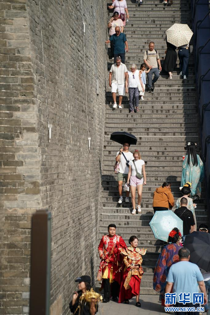 9月12日,游客在西安城墙永宁门内游览,左侧城墙上布设着墙体裂缝监测仪。