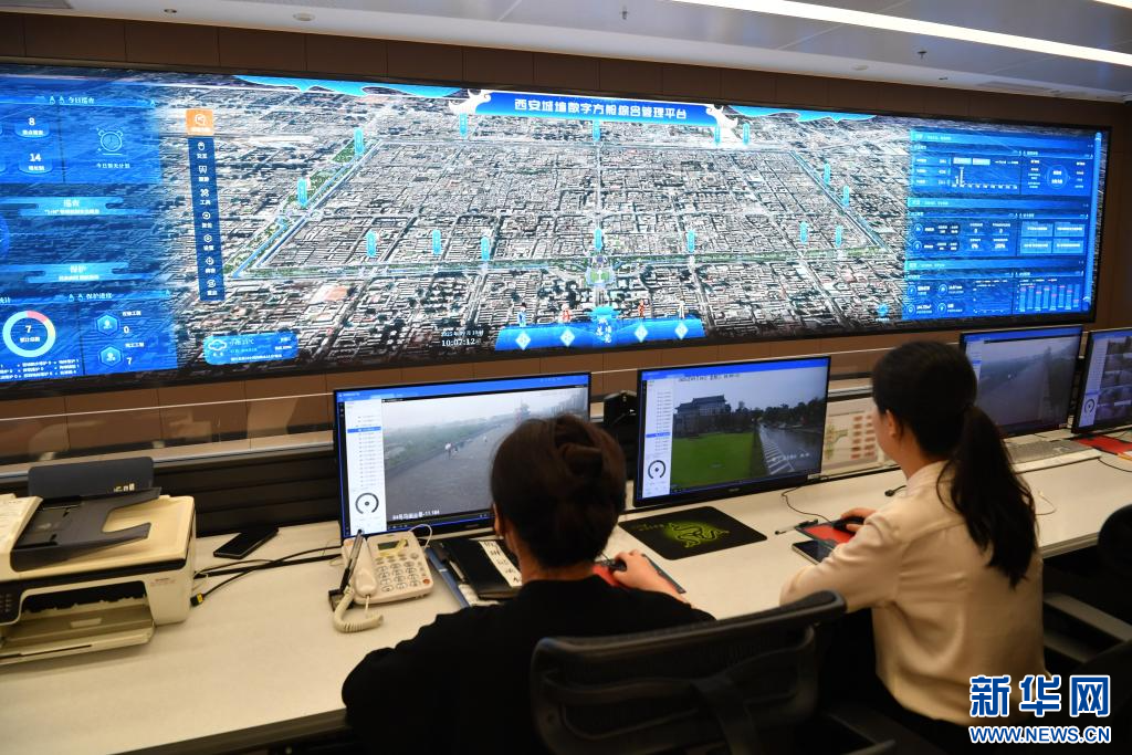 9月10日,工作人员通过西安城墙数字方舱综合管理平台开展工作。