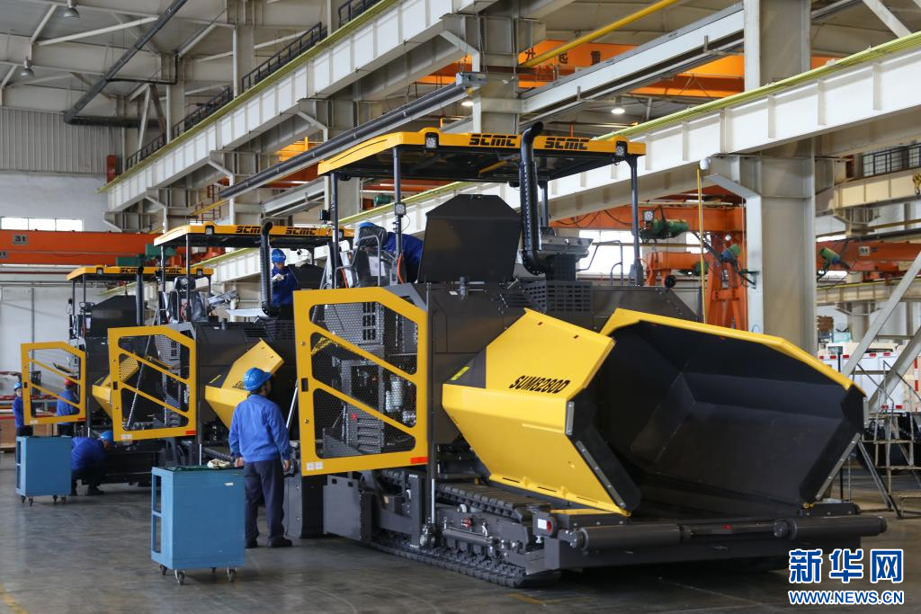 在陕西建设机械股份有限公司装配车间,工人进行摊铺机的生产工作。新华网 王智超摄
