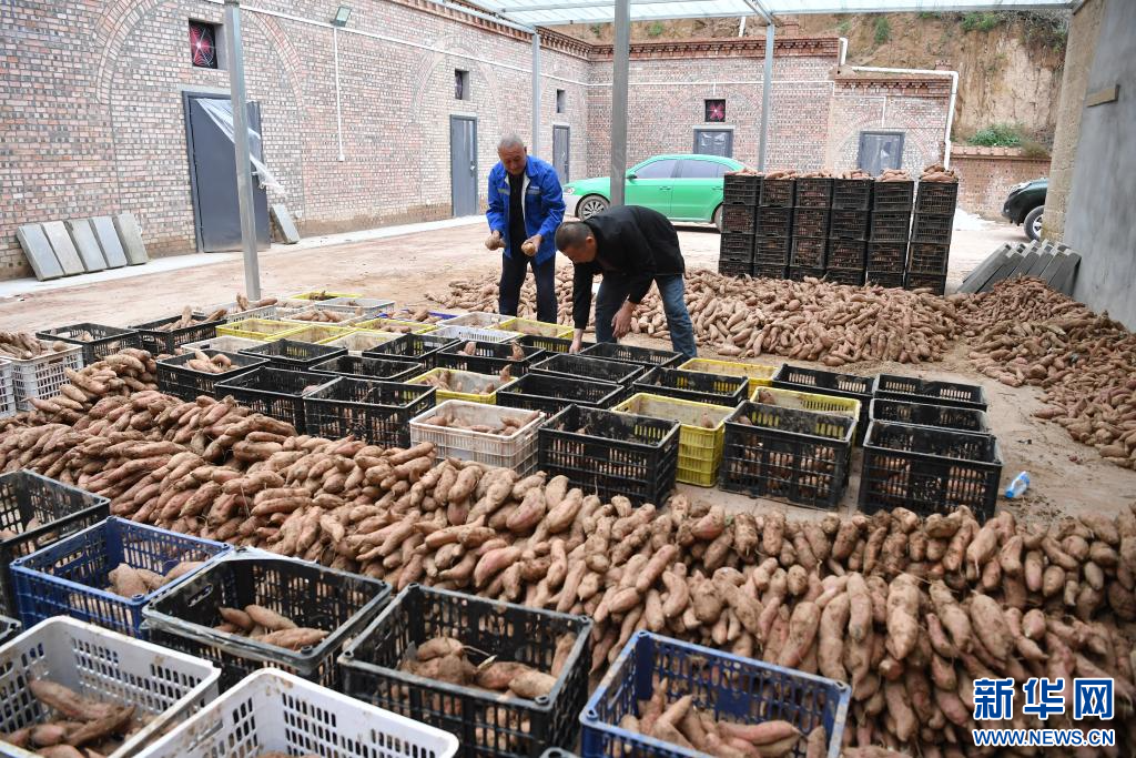 10月16日,延安市宝塔区甘谷驿镇罗家湾村村民在整理收获的红薯。