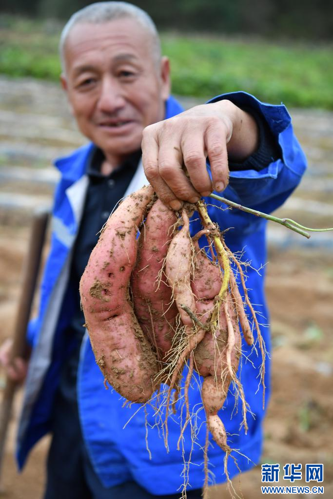 10月16日,延安市宝塔区甘谷驿镇罗家湾村村民罗维阳展示收获的红薯。