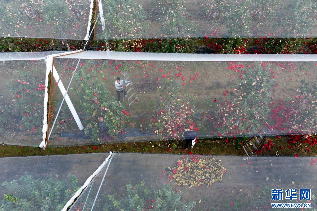 10月17日,果农在延安市宝塔区桥沟街道烟洞沟村苹果园内摘掉苹果套袋(无人机照片)。